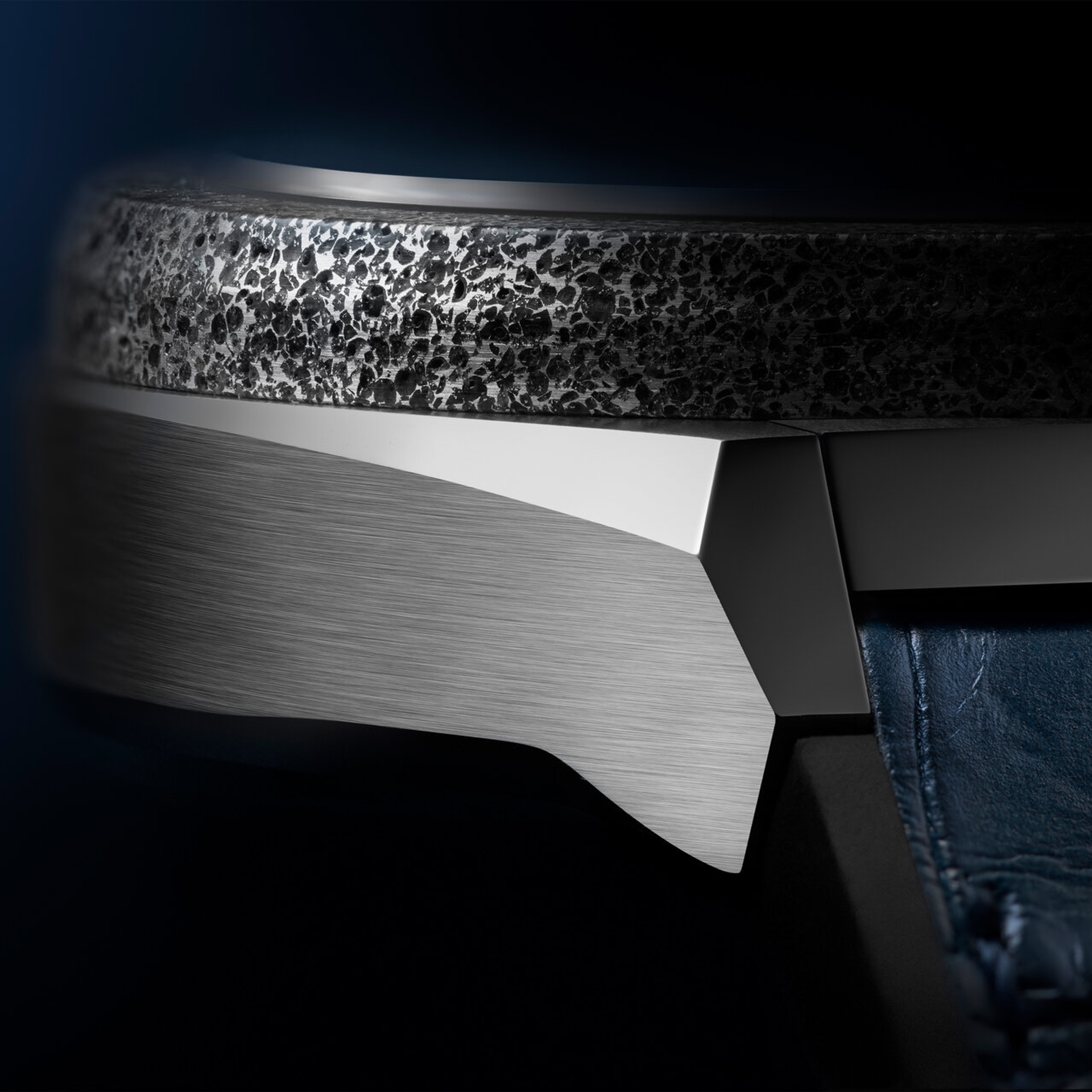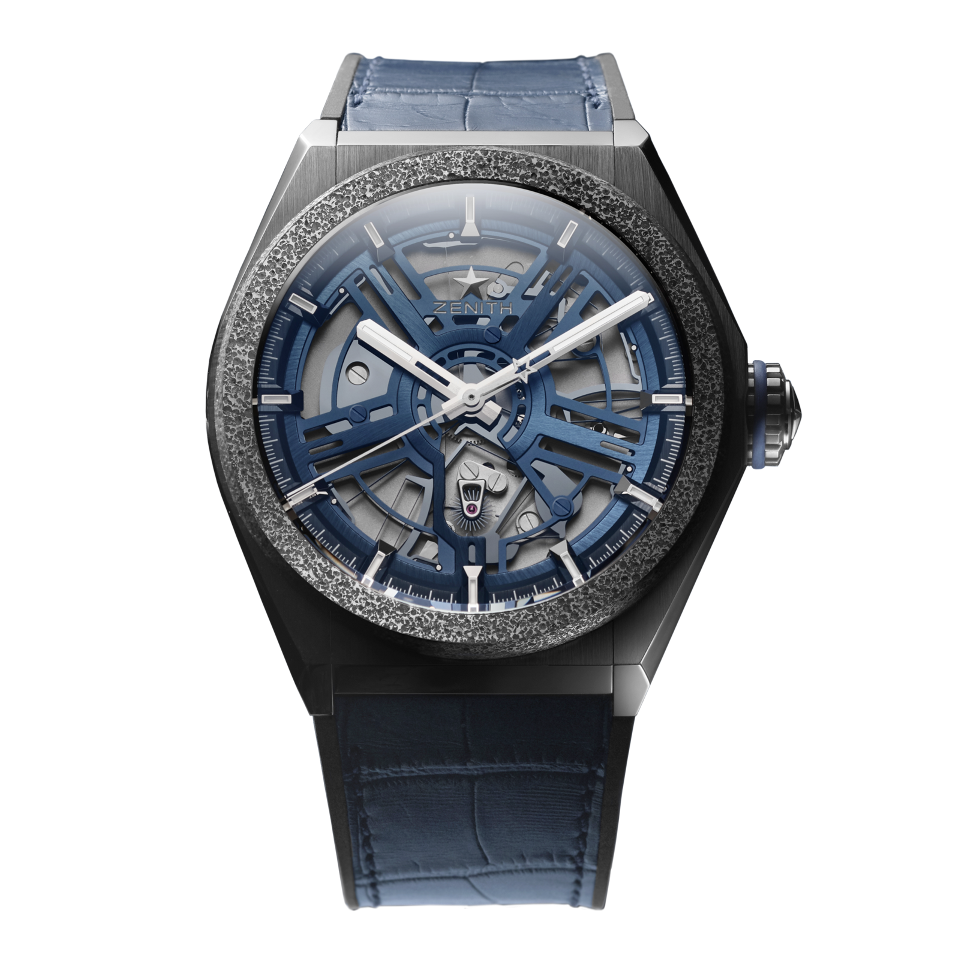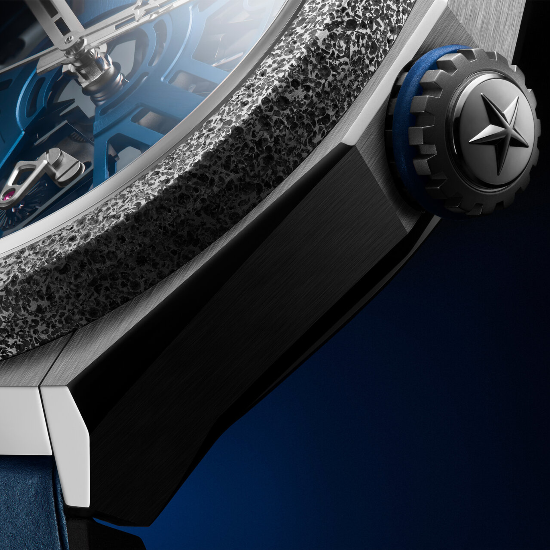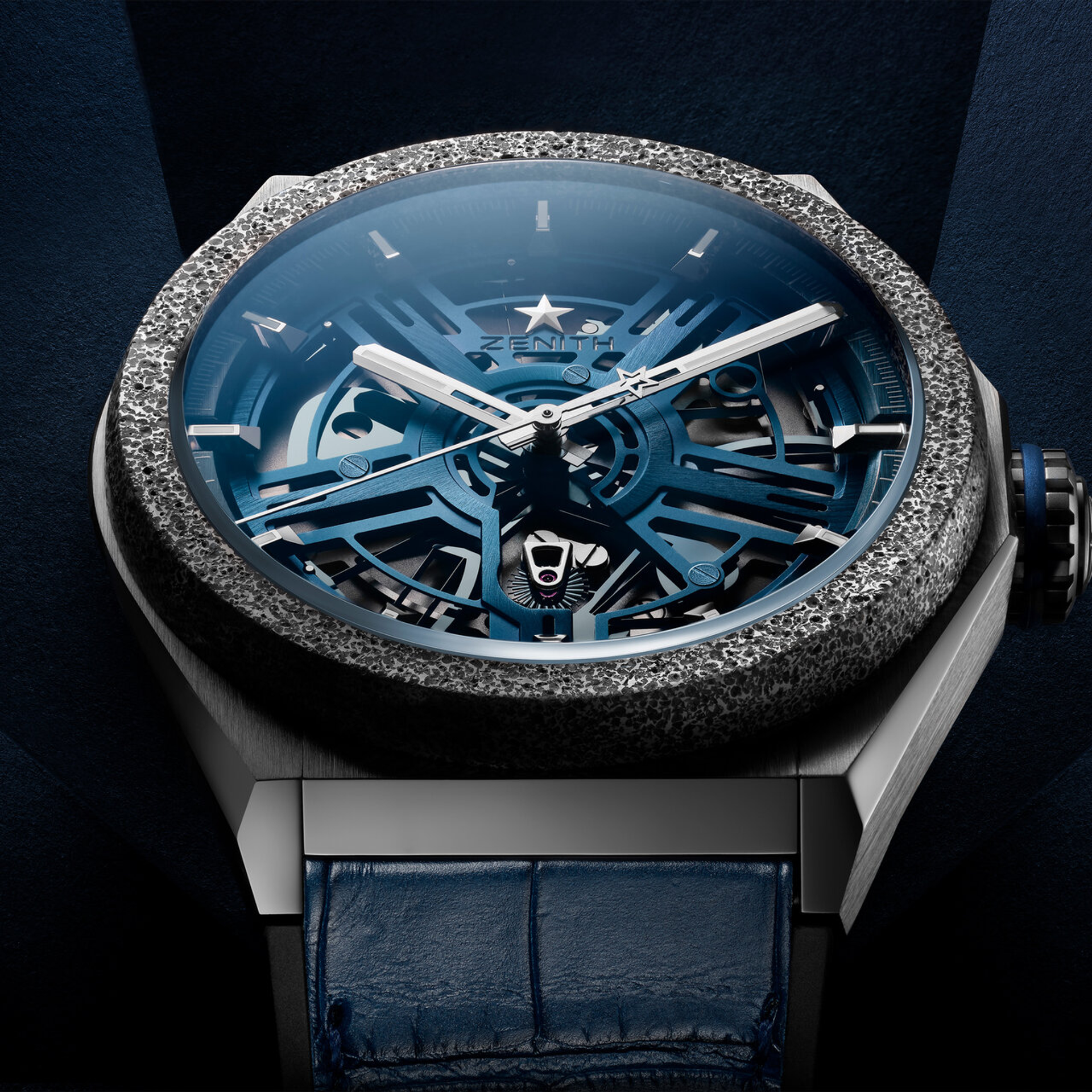 Presented in the Defy Lab in 2017, Zenith's revolutionary oscillator is now greenlighted for serial production in the Defy Inventor. This strategic component is manufactured as a single, ultra-thin part operating at a very high frequency of 18 Hz (129,600 vib/h) and replaces the thirty-some parts of a standard regulator, eliminating friction, wear and deformation. Made from monocrystalline silicon, it is unaffected by variations in temperature or magnetic fields. Building on these properties, Zenith has set an objective of +/- 0.5 second/day precision. For the present time, Calibre 9100 is chronometer-certified by TimeLab in Geneva. It resides in a lightweight titanium case with a bezel made from Aeronith, an aluminium composite.