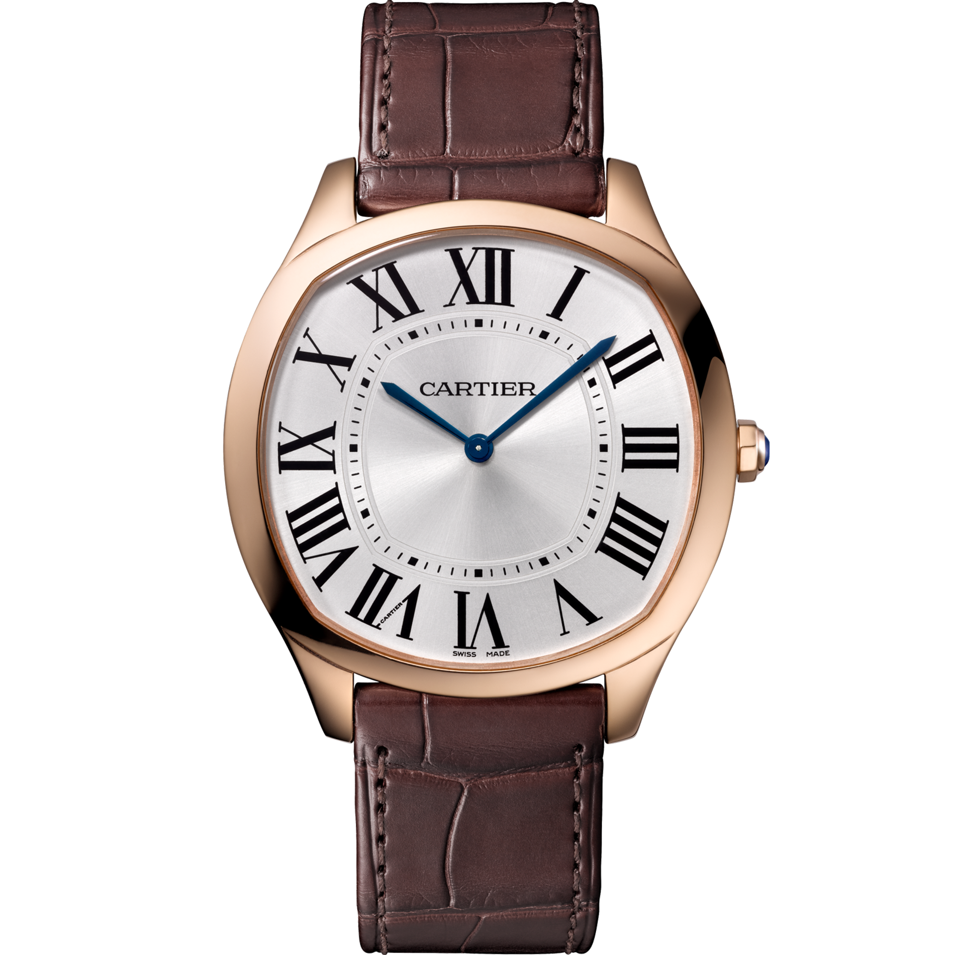 The Drive de Cartier collection succeeds in combining elegance with an assertive design. After the three references that launched the range in 2016 - hours/minutes/seconds, second time zone, and flying tourbillon – two new interpretations have arrived in the form of a moon phase and this extra-thin version. Measuring less than 7 mm high (40% slimmer than the original), this new style puts the emphasis on sobriety and the cushion shape of its case surrounding the radial brushed, satin-finish dial. Driven by the manual-wind 430 MC calibre, one of the thinnest on the market, this Drive de Cartier Extra-Flat comes in pink gold, alongside a limited edition of 200 in white gold.