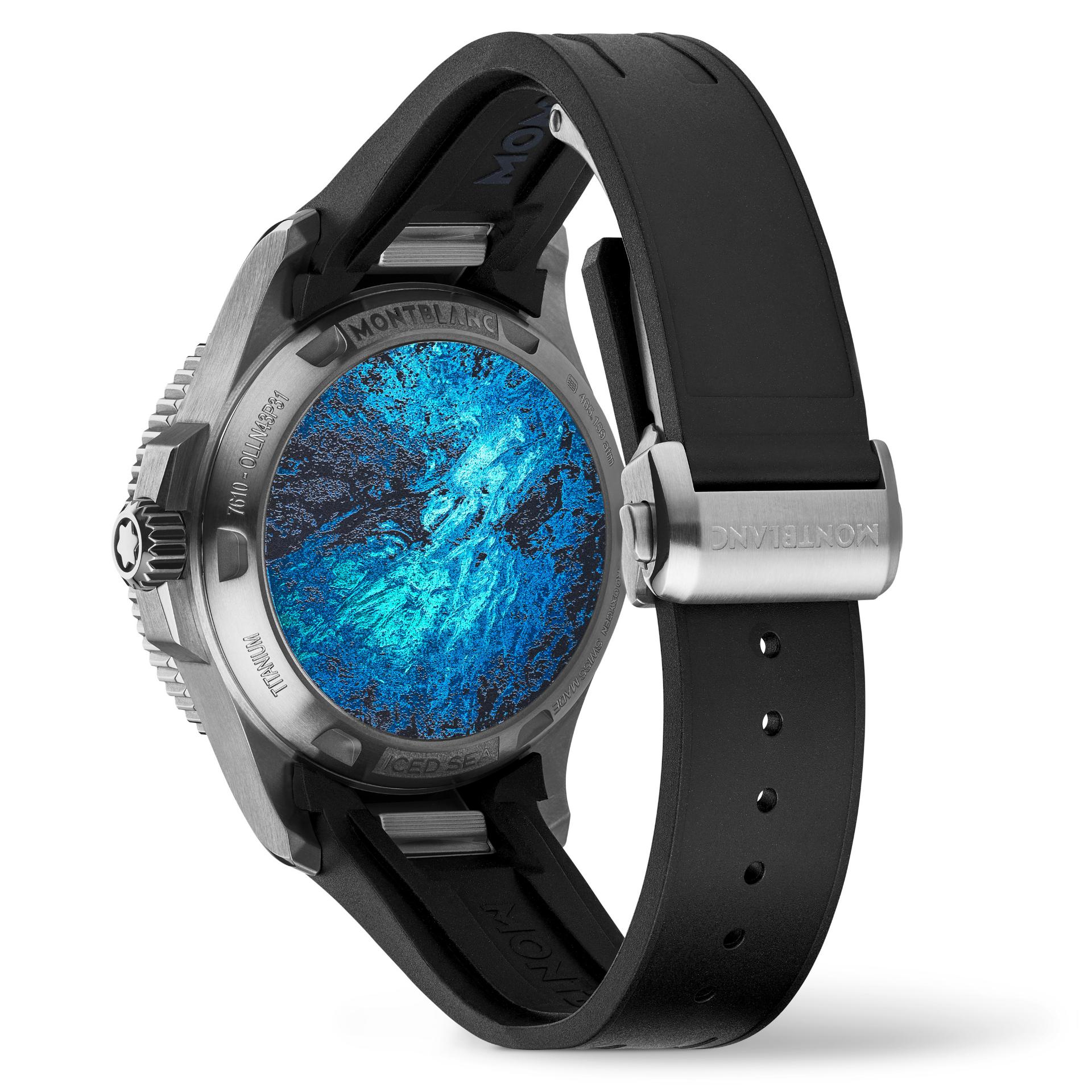 Debuting in 2022, Montblanc's Iced Sea dive watches are modelled on the Mer de Glace (Sea of Ice), which is the main glacier of the Mont Blanc massif. This inspiration is nowhere clearer than in the glacier pattern on the gratté-boisé dial and the laser-engraved case back. In 2024 Montblanc continues to push the boundaries of the collection with the introduction of the Iced Sea Oxygen Deep 4810. Built for underwater exploration, it is engineered to withstand pressure equivalent to 4,810 metres below sea level (as deep as Mont Blanc is high). A noticeable feature of this model is the complete absence of oxygen inside the 43mm titanium case. This eliminates fogging and prevents oxidation. The view seen by divers venturing under the ice is engraved in colour on the back of the case, using a technique that achieves exceptional depth and realism. Once the relief of the design has been laser-engraved, combining matte and gloss finishes, colour is added by laser oxidation. The movement is the automatic MB 29.29 which has COSC chronometer rating. Running at 28,800 vibrations/hour and with five days of power reserve, it drives displays of hours, minutes, seconds and date. An adjustable strap adds the final touch.