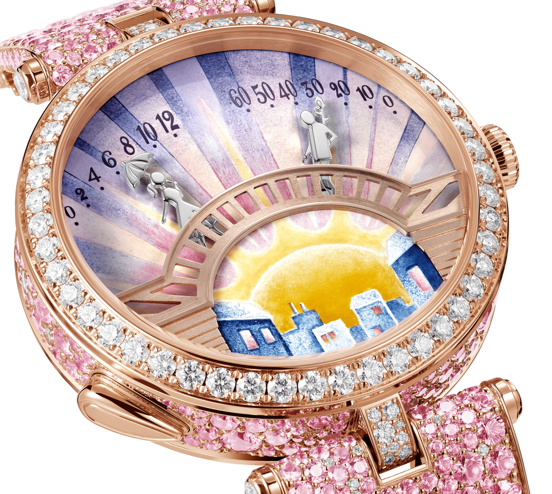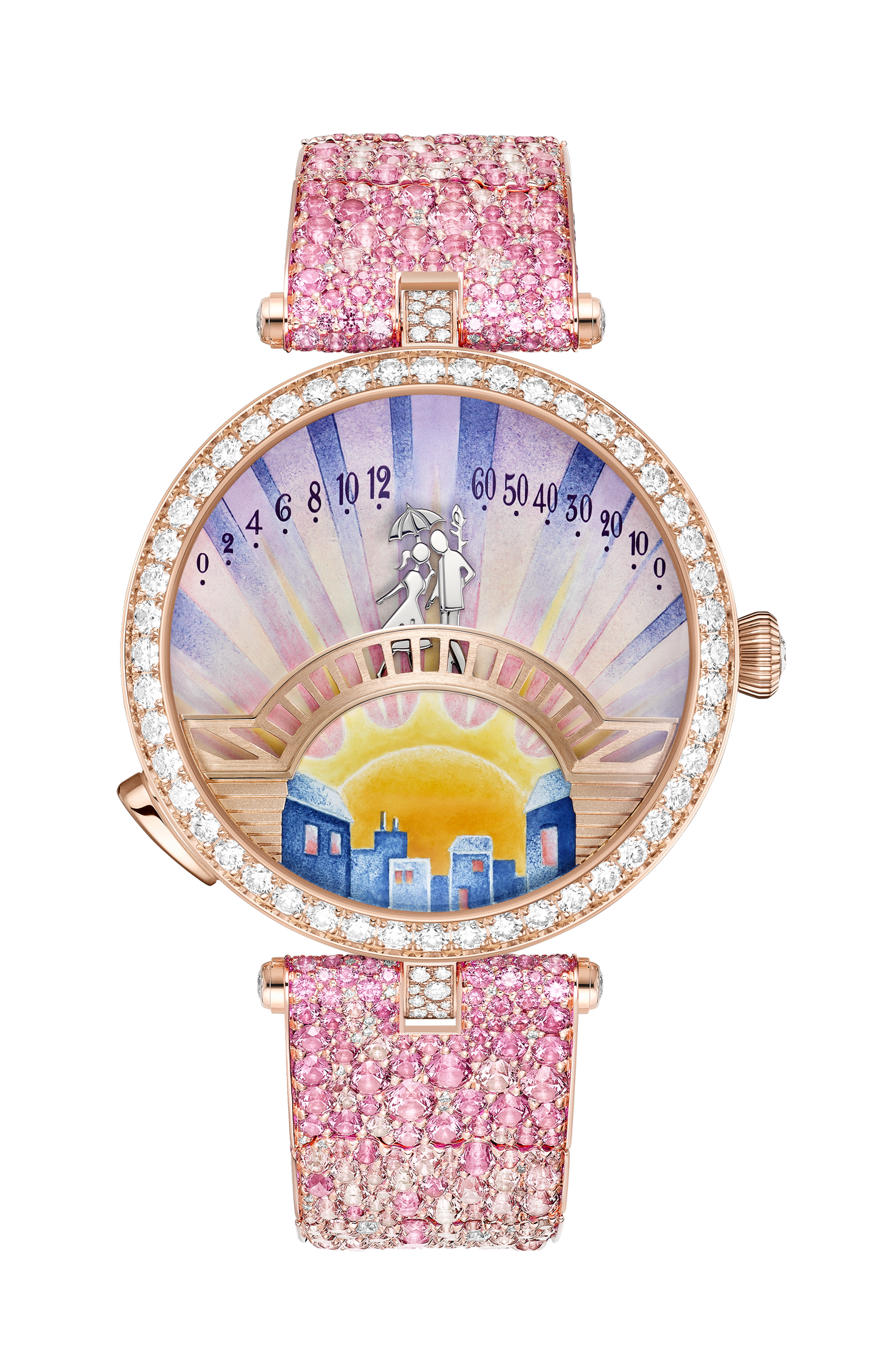 In 2010 Van Cleef & Arpels unveiled the Pont des Amoureux watch, which was singled out for distinction at the Grand Prix d’Horlogerie de Genève. By means of a bi-retrograde movement, a gentleman and his sweetheart move from opposite ends of a bridge to meet in the centre at midday and midnight, where they kiss for three minutes before separating to again indicate the hours and minutes. The scene can be played on-demand for a dozen seconds. Four precious versions add to the collection in 2025, portraying the couple at dawn, in the morning, in the evening and by moonlight. Each decor is crafted in coloured grisaille enamel. The outline of the bridge, in the foreground, is finely sculpted in gold to create an effect of depth. The scene continues on the reverse side, in enamel decal on sapphire crystal and engraving on gold. All four watches are worn on bracelets encrusted with diamonds and sapphires in a gradient: light or deep pink for the Aube and Soirée models, light or deep blue for the Matinée and Clair de Lune models.