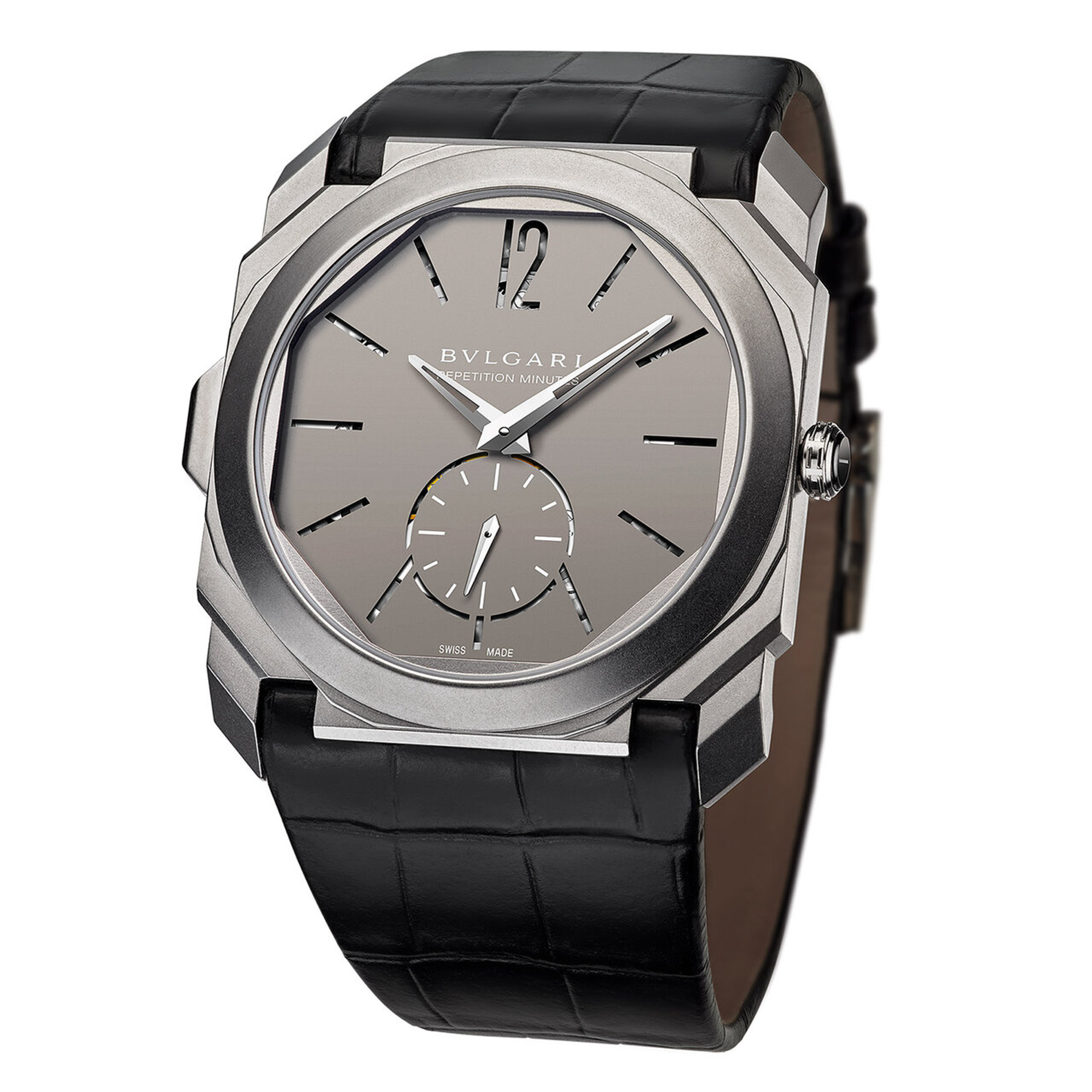 After the thinnest tourbillon watch in the world, Bulgari takes on one of the ultimate horological complications and presents the thinnest minute-repeater on the market. With a movement whose height does not exceed 3.12 mm and a case 6.85 mm thick, this Octo presents a remarkably slender profile. The greatest challenge, however, was to attain excellent quality of sound within such a small space. Bulgari achieved this by housing the manual-winding movement in a titanium case. Titanium is renowned not just as a very lightweight metal but also because it enables optimal diffusion of the sound in a striking watch. Furthermore, the hour-markers are cut out of the titanium dial so as to amplify resonance inside the case: a stroke of genius which also has the advantage of emphasising the ultra-contemporary aesthetic of this 50-piece limited edition.