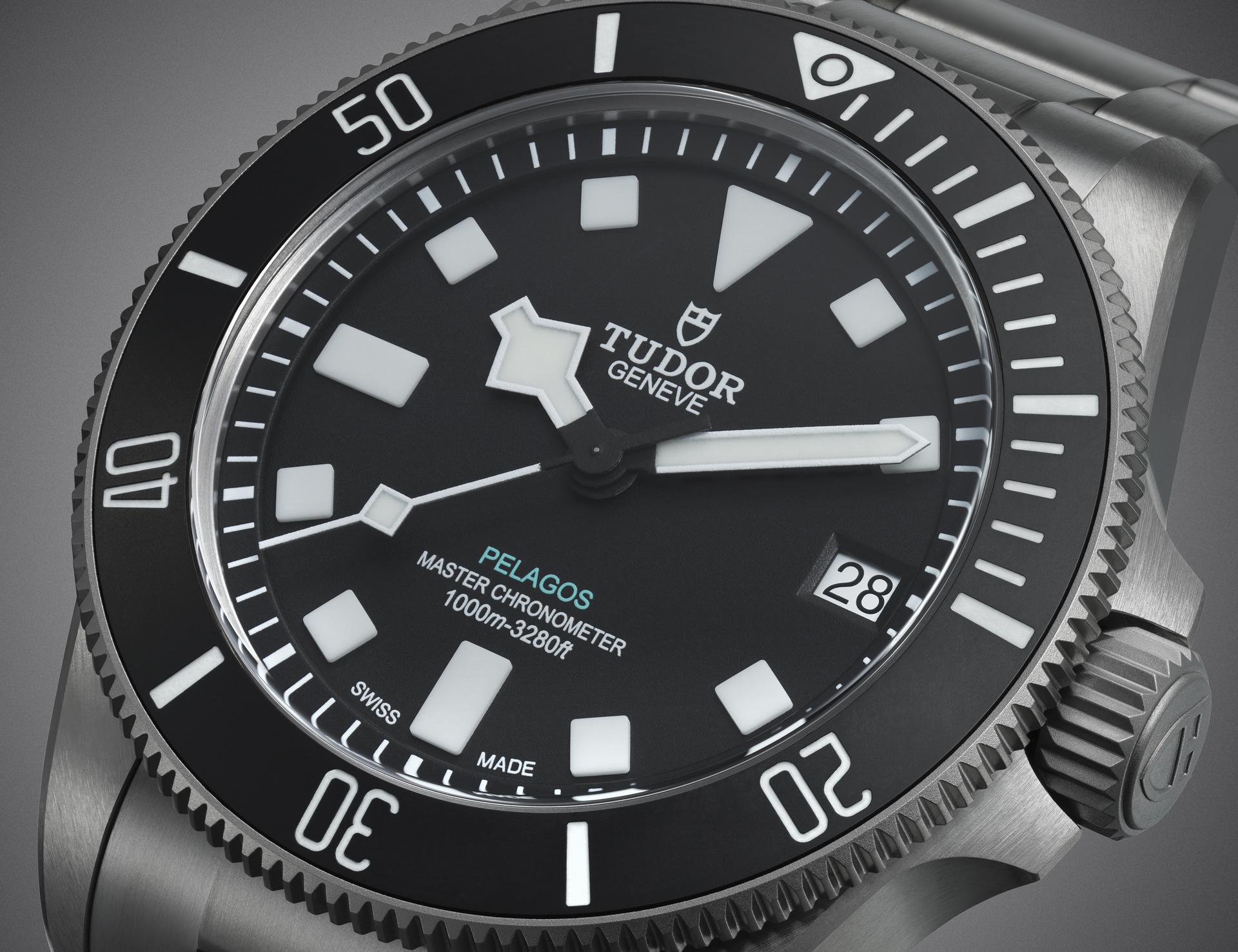 Engineered to meet the demands of saturation diving, the Pelagos Ultra is Tudor’s most technically advanced dive watch to date, with a depth rating of 1,000 metres and a patented bracelet extension system. The redesigned case is constructed from grade 2 and grade 5 titanium, measures 43mm across and incorporates a compact helium escape valve. Legibility is a key focus, as demonstrated by the larger dial, compared with the standard Pelagos, wider hands, bigger indices and the minute hand that glows green, as does the triangular bezel pip for keeping track of dive time. Equipped with the Tudor Manufacture MT5612-U calibre which delivers 65 hours of power reserve, the Pelagos Ultra is tested by METAS to Master Chronometer standard, which sets some of the industry’s most demanding requirements for precision and resistance to magnetic fields.