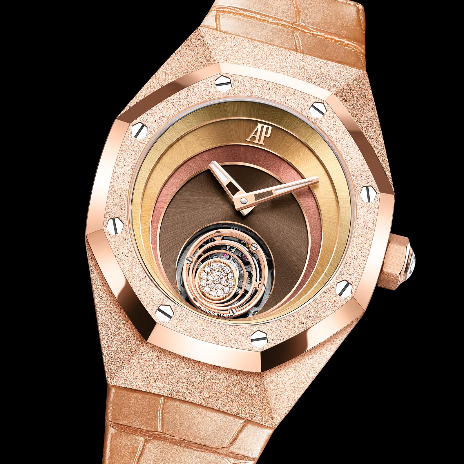 Audemars Piguet presents a Royal Oak Concept Flying Tourbillon in collaboration with the couturière Tamara Ralph. Inspired by the femininity and creativity of Tamara's Haute Couture designs, this 102-piece limited edition in rose gold shimmers with a Frosted Gold finish – an ancient Florentine jewellery technique that was adapted by Audemars Piguet's artisans in 2016. In a palette of rose, bronze, gold and cognac tones, four circles in rose gold form the dial, rising in layers like a wave rippling outwards from the flying tourbillon at 6 o'clock to produce an astonishing impression of depth. Mirroring this multi-layered architecture, the tourbillon's cage incorporates three rings around an off-centre disc that sparkles with 19 brilliant-cut diamonds. This motif is repeated in the manual-winding Calibre 2964, whose back bridges are decorated with five progressively larger circles that radiate from the back of the flying tourbillon cage.