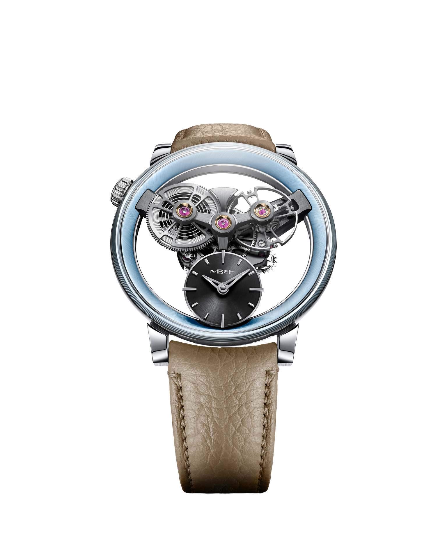 Initially dubbed "Three Circles", the MB&F SP One showcases a trio of floating elements: the barrel, the balance wheel and the dial which, visible through sapphire domes, appear to hover at the centre of an amphitheatre. It comes cased in a 38mm pebble-shaped shell with no bezel and detached lugs. While this may be MB&F’s slimmest and smallest watch yet, it stays true to its signature three-dimensional architecture and spirit. Somewhere between the brand’s radical Horological Machines and its more classic Legacy Machines, the SP One inaugurates the “Special Projects” collection. It launches in two editions: one in platinum with a sky-blue bevelled flange and another in rose gold with an anthracite bevelled flange.