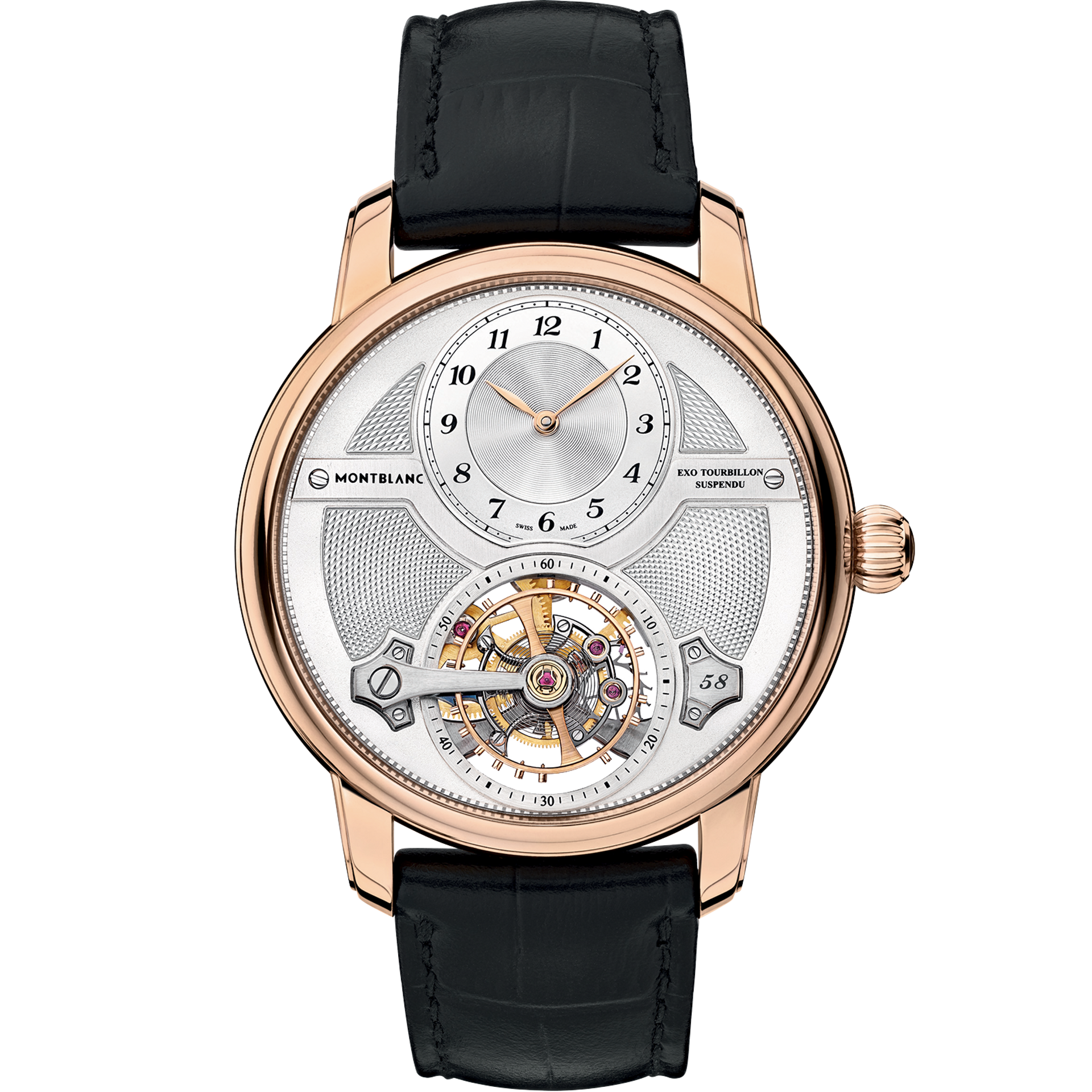 Engineered for maximum visibility, the tourbillon is the main attraction of this watch. Three years in development, this complication builds on Montblanc's patented idea to position the balance outside the tourbillon cage. Because it no longer carries the weight of the balance wheel, this Exo Tourbillon uses considerably less energy. So as to further accentuate visual impact, Montblanc's engineers have suspended the tourbillon from a bridge with just one arm. This three-dimensional effect is all the more striking given the imposing 14.5mm diameter of the balance wheel, and its position "floating" 3.2mm above the dial – with no increase in the size of the movement or the case. Proposed as a limited edition of 58 pieces in red gold and 28 with a diamond-set case.