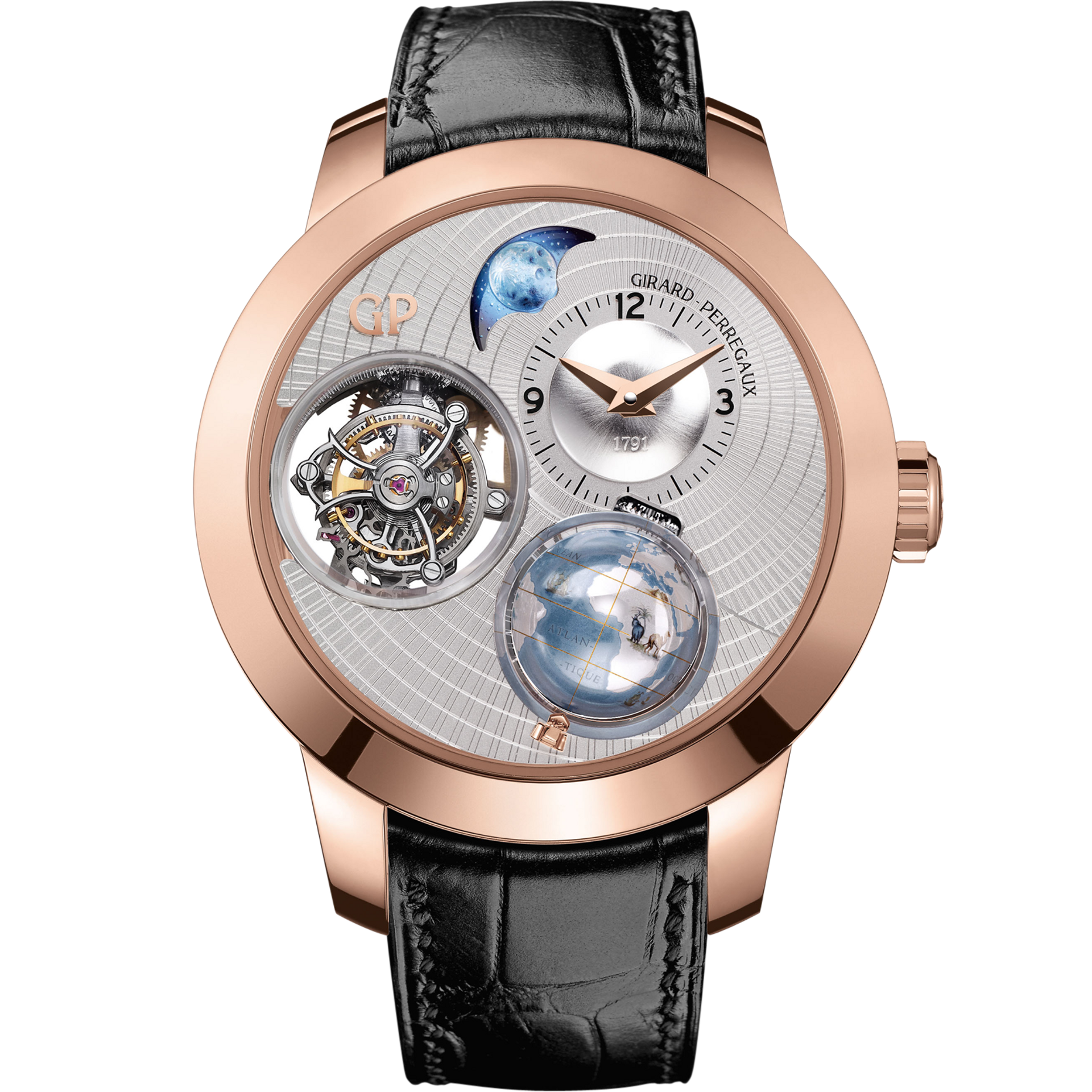 Three years after unveiling its Tri-Axial tourbillon, Girard-Perregaux puts performance and precision centre-stage again. Still taking pride of place, the high-speed tourbillon, whose regulator rotates on three axes instead of just one, is now joined by two fascinating complications. On one side, a precision moon phase that requires a single adjustment after 122 years. On the other, a rotating globe with day/night indication. Hand-painted, it depicts in miniature the world as it was in 1791, the year Girard-Perregaux was established. This charming journey through time and space takes place against an elegant silvered dial whose guilloché pattern suggests the earth's meridians. The more curious observer can take advantage of the sapphire back and the side openings in the 48-mm case to admire the intricacy of the highly accomplished, manual-wind movement.
