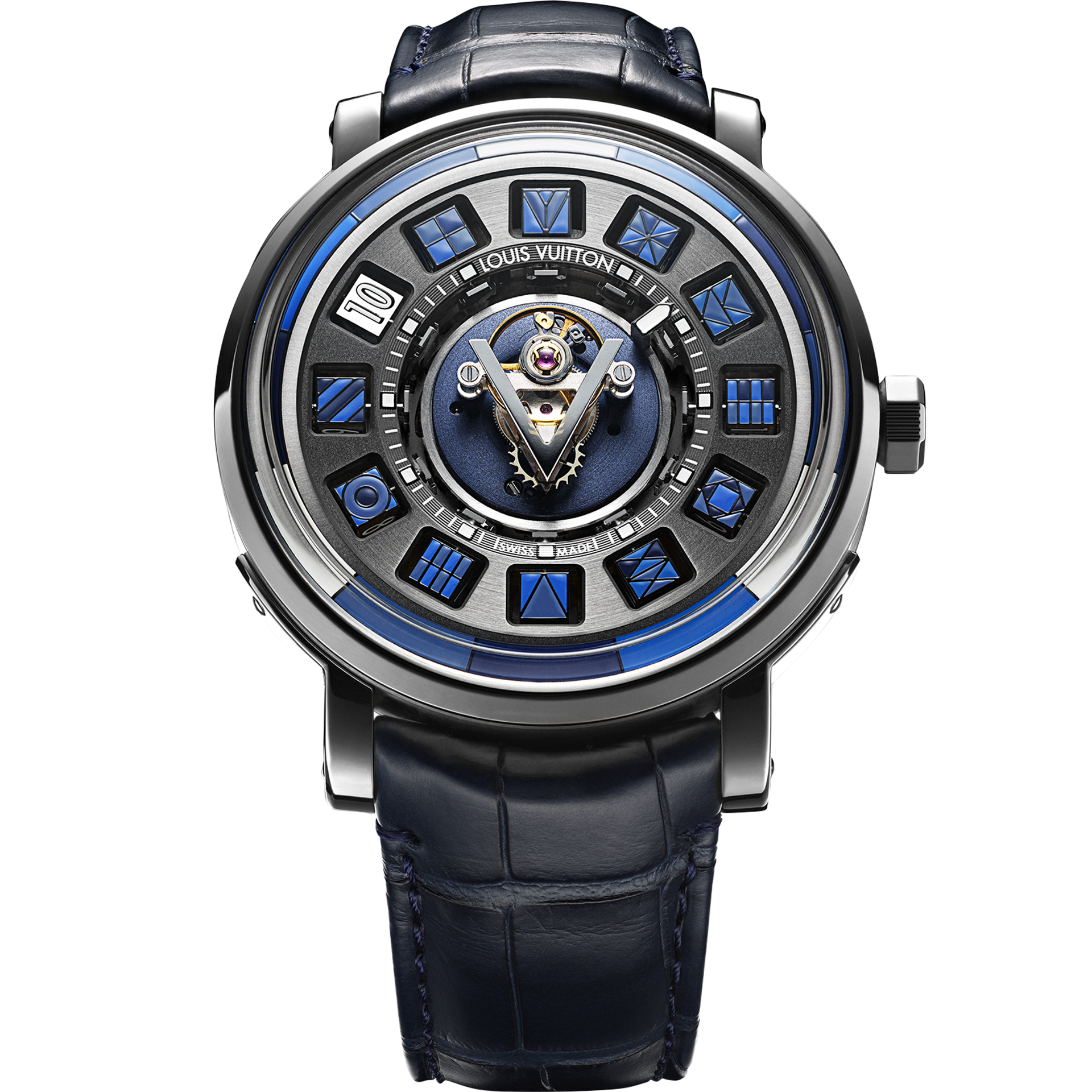 Louis Vuitton poursuit ses variations sur les thèmes du bleu et du V avec cette pièce très contemporaine qui associe désormais un tourbillon central à l’affichage original des heures par un système de 12 cubes rotatifs. Le mouvement Spin Time n’est pas nouveau puisqu’il a été dévoilé pour la première fois en 2010 au cœur du boîtier de la montre Tambour. Grâce à ce procédé innovant, le garde-temps change de visage au fil des heures qui passent, les cubes révélant alors des drapeaux dont la géométrie particulière est peinte en décalque de manière artisanale. Le spectacle ne s’arrête pas là puisque, au centre du cadran, le regard est invariablement attiré par le tourbillon volant qui effectue sa rotation en une minute. Comme suspendue, libérée de toute attache, sa cage est ornée du célèbre V dessiné par Gaston Vuitton en 1901. En majesté, au cœur du boîtier Escale en titane et platine alternant finitions polies et finitions satinées, la signature de Louis Vuitton semble prête à faire tourner toutes les têtes.