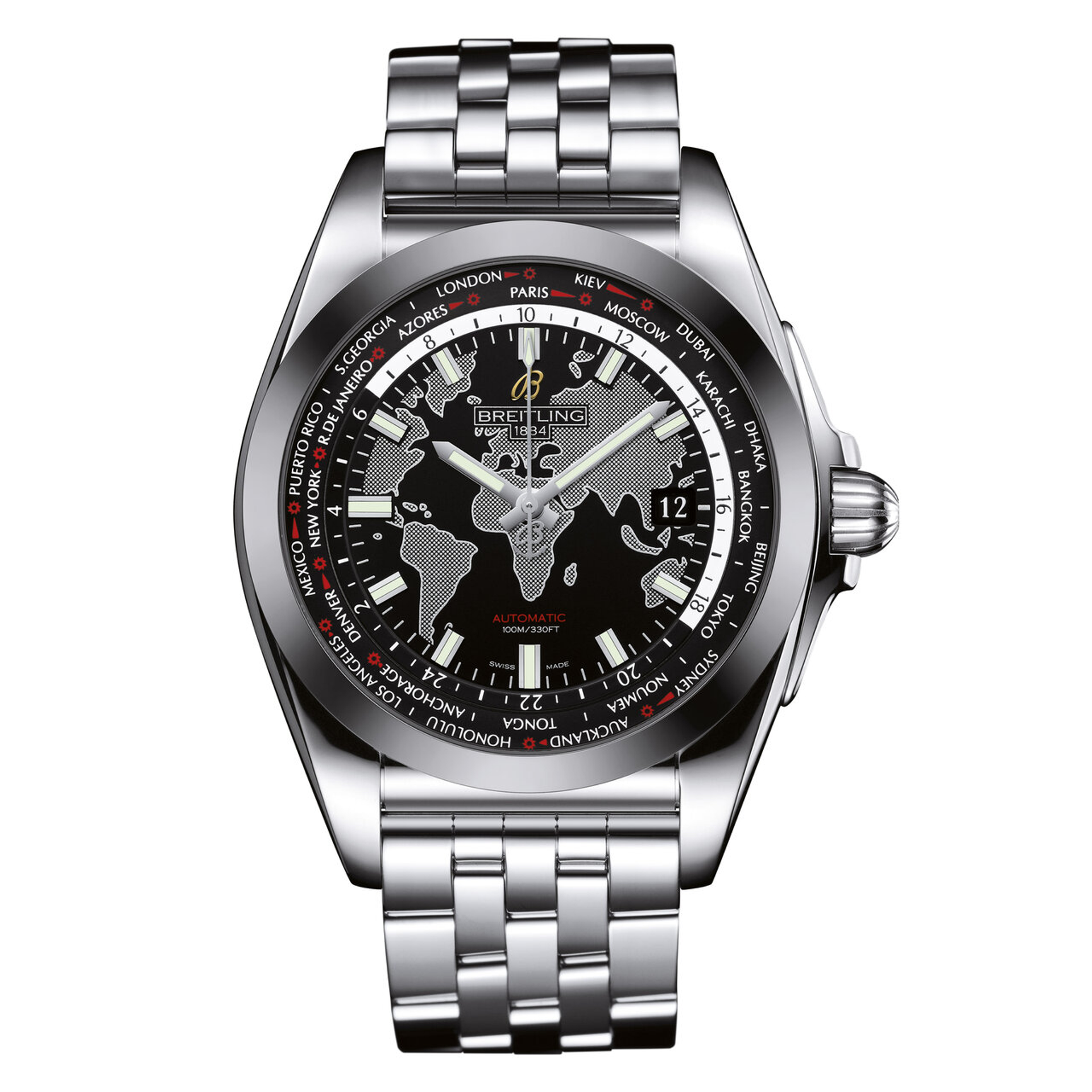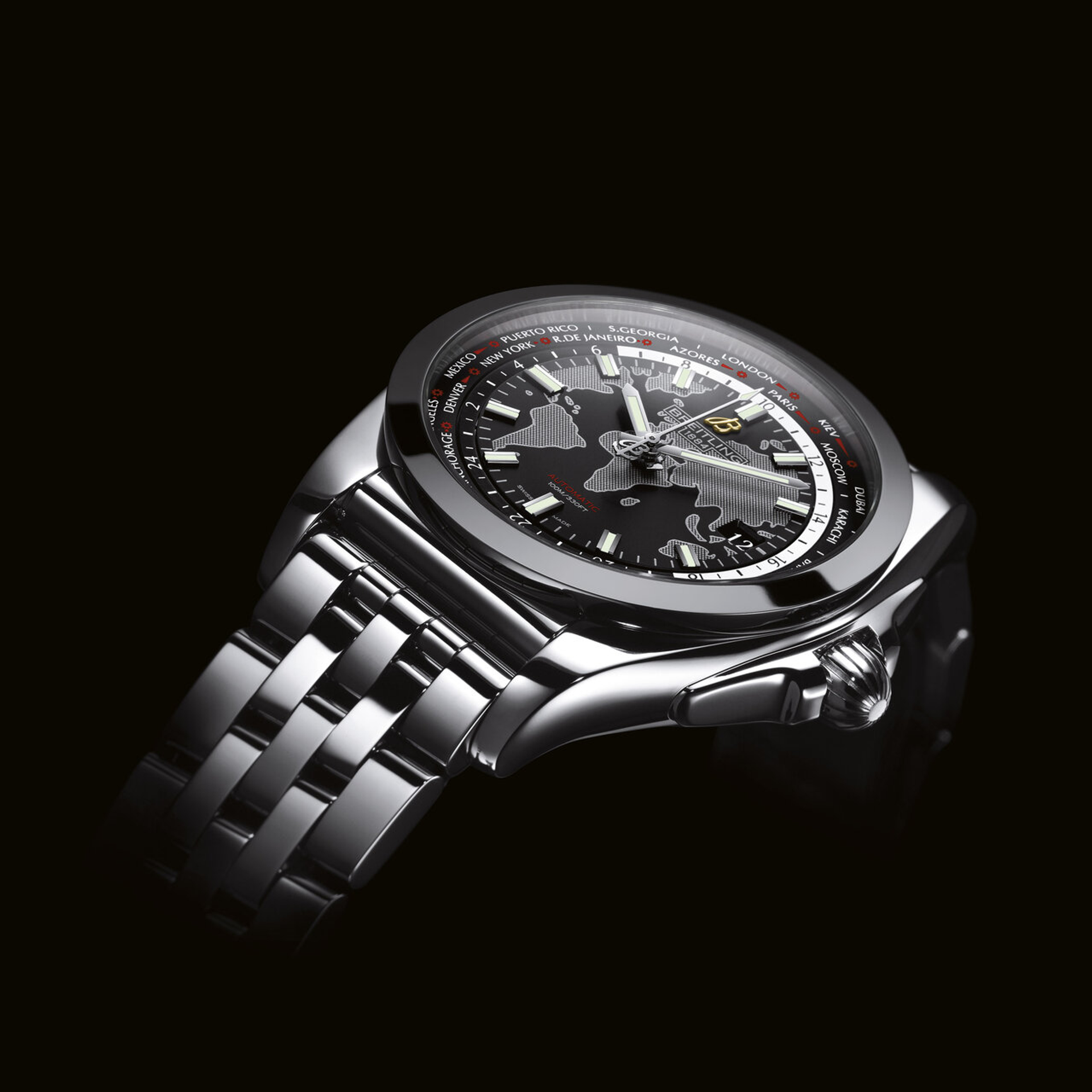 On the technical side, the Galactic Unitime SleekT worldtime watch, adorned with a filigree-worked globe motif, is equipped with the very first Manufacture Breitling calibre with no chronograph. It is distinguished by its unprecedented user-friendliness, based on two patented innovations: a single gesture is enough to correct all dial indications. On the design side, the steel case is topped by an ultra-sturdy tungsten carbide bezel that is five times harder than steel and also scratch-resistant. This remarkable legible creation is entirely in tune with the Breitling “instruments for professionals” spirit.