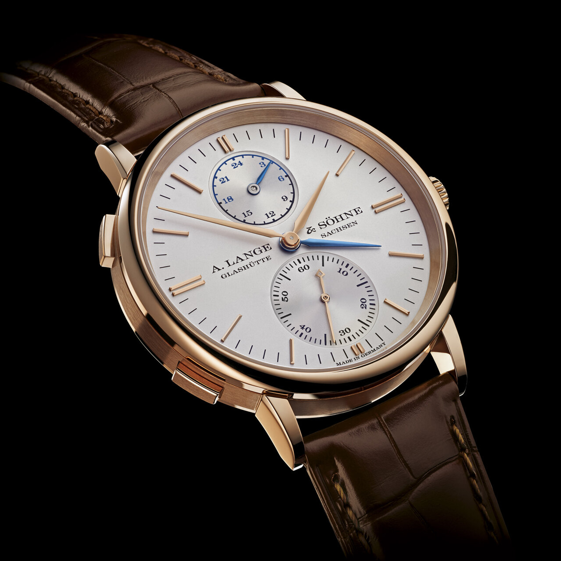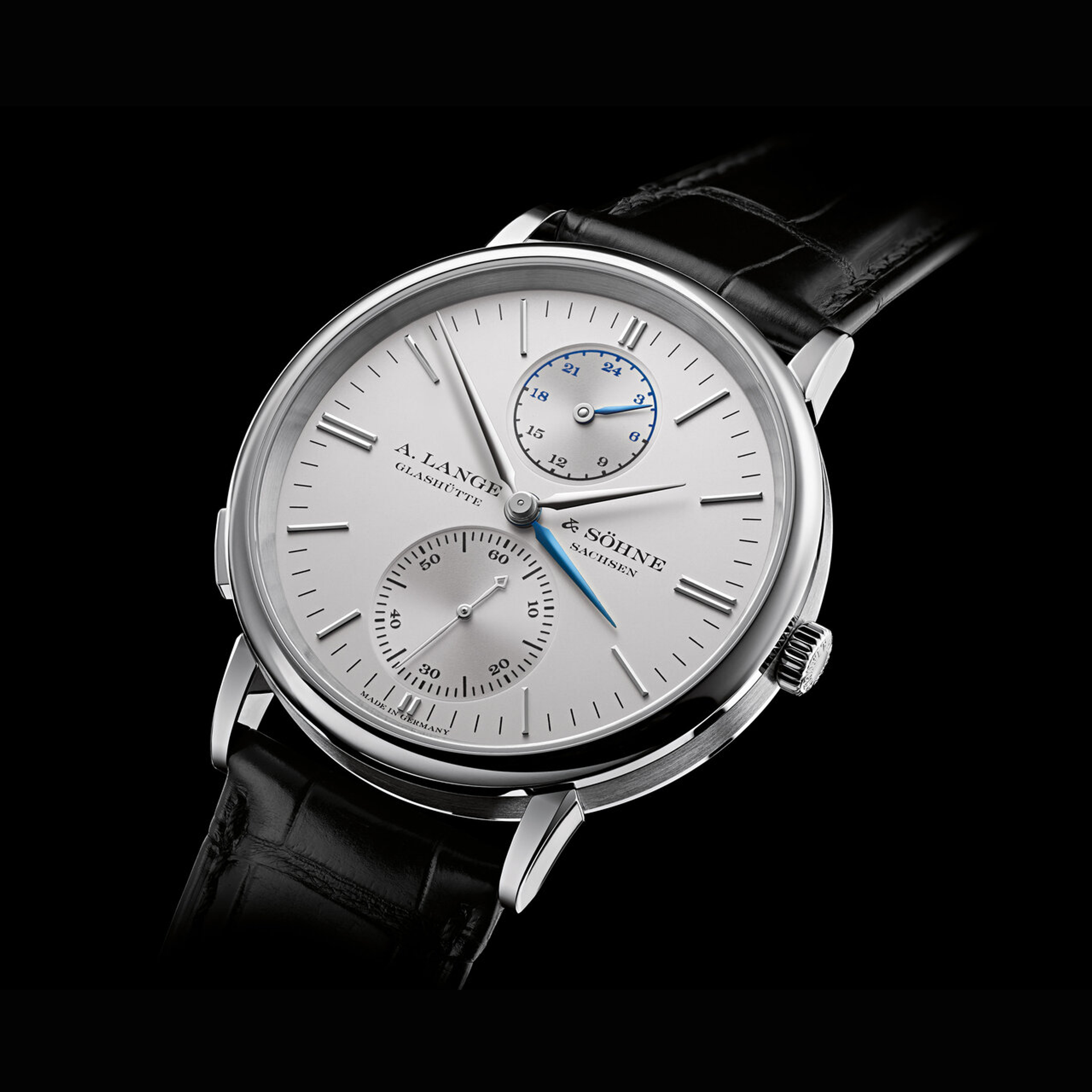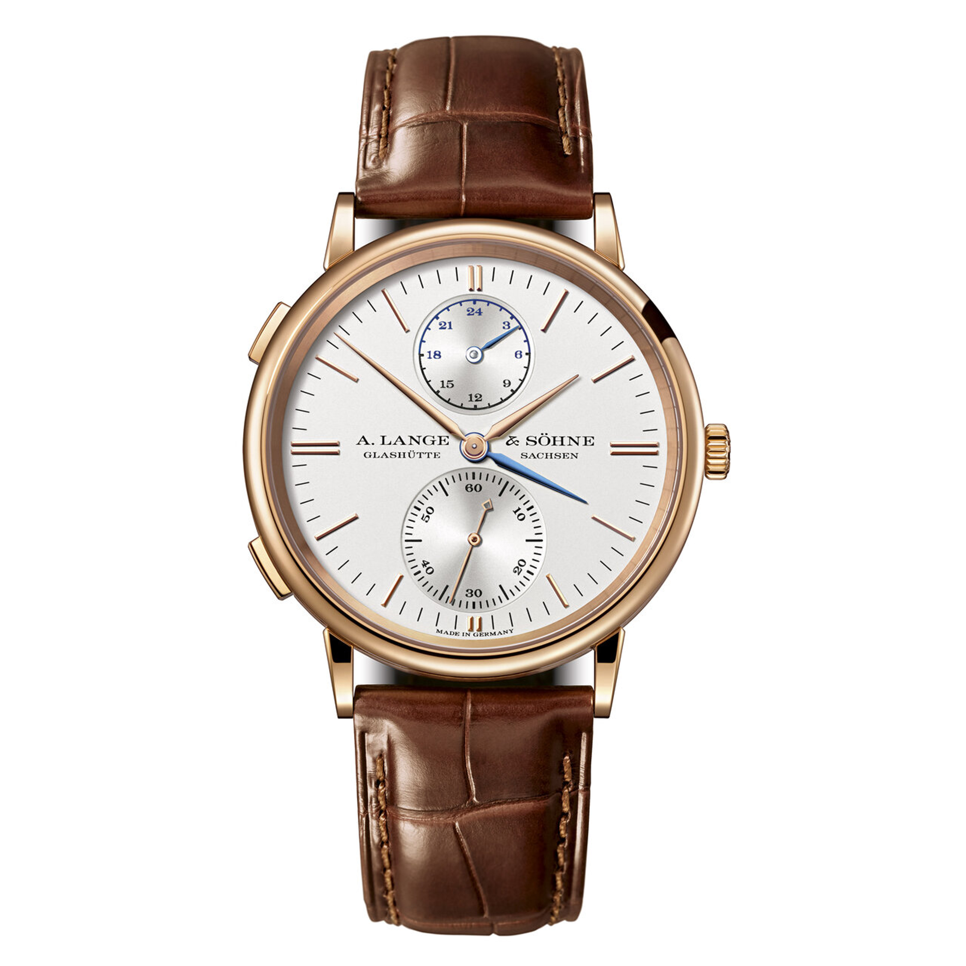 A. Lange & Söhne has introduced subtle changes to the elegant dials of its Saxonia family to further enhance their legibility. The solid gold hour-markers have been moved closer to the edge of the dial, with double batons at 3, 6, 9 and 12 o'clock, while the markers for the minute scale have been slightly extended. The subsidiary seconds on the Saxonia Dual Time is newly endowed with Arabic numerals for the tens. The case has been reduced in size to a 38.5 mm diameter.