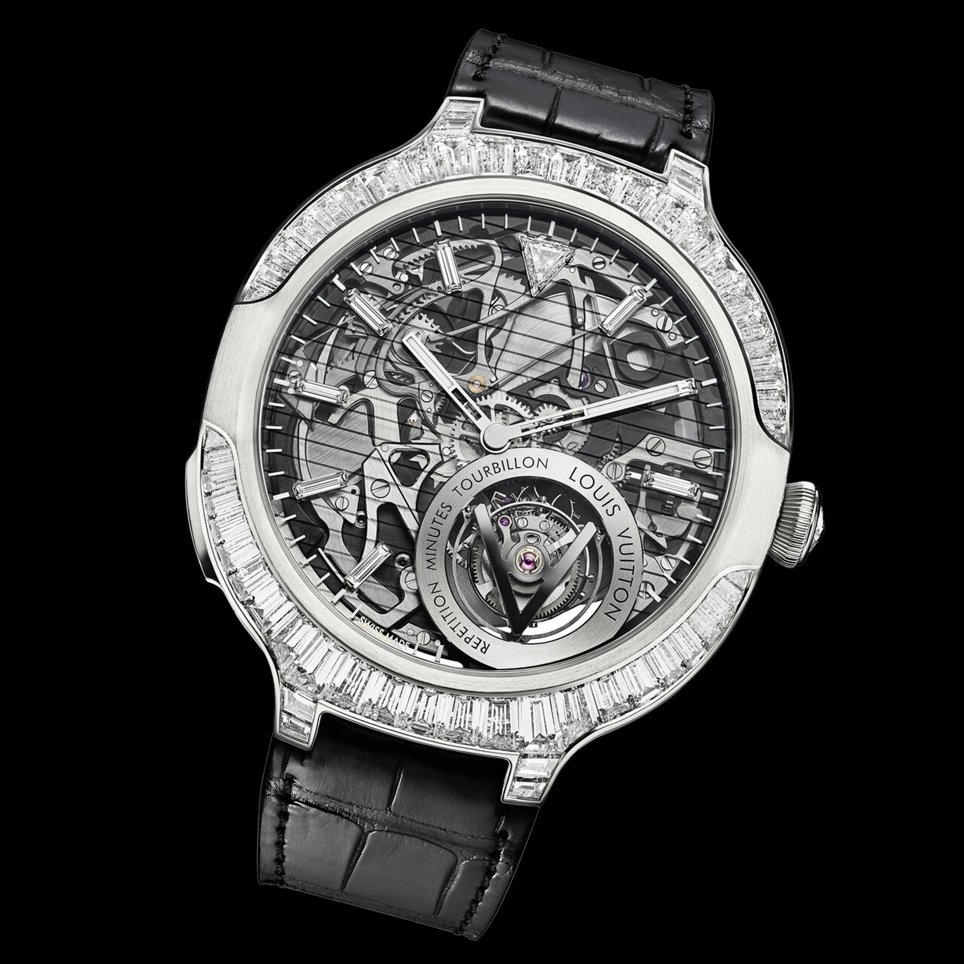 Louis Vuitton brings two prestigious complications – a minute repeater and a flying tourbillon – inside a Voyager case, recognisable by its not-quite-round, not-exactly-square shape. Two versions are proposed: the sobriety of white gold with polished and satin finishes, or with the addition of eight carats of baguette diamonds on the bezel and lugs. Despite the complexity of the movement, which provides four days of power reserve, this is a remarkably thin watch – one of the slimmest in its category – at 9.7mm high. All eyes are on the mechanism, revealed in all its splendour through the sapphire crystal dial and caseback. Passing hours and minutes, completed by a V-shaped small seconds display on the tourbillon carriage, transform time into music, chimed on the minute repeater's cathedral gongs – a first for Louis Vuitton.